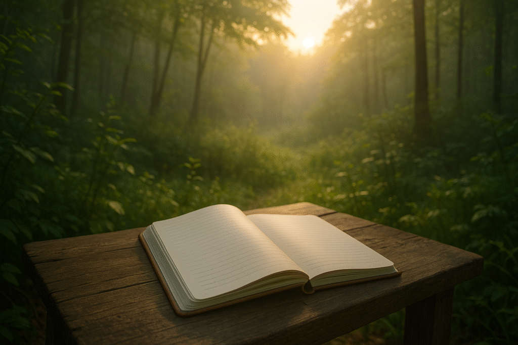 “A woman standing in a sunlit field, eyes closed, surrounded by peace and stillness.”